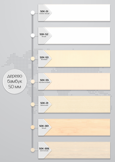 Цвета верхнего и нижнего карнизов, а также шнуры и лесенки подбираются максимально близко к цвету полотна ламелей автоматически при изготовлении изделия. Цвет и материал нижнего карниза и прута управления соответствует цвету ламелей. Цвет декоративной лесенки вы можете подобрать индивидуально.