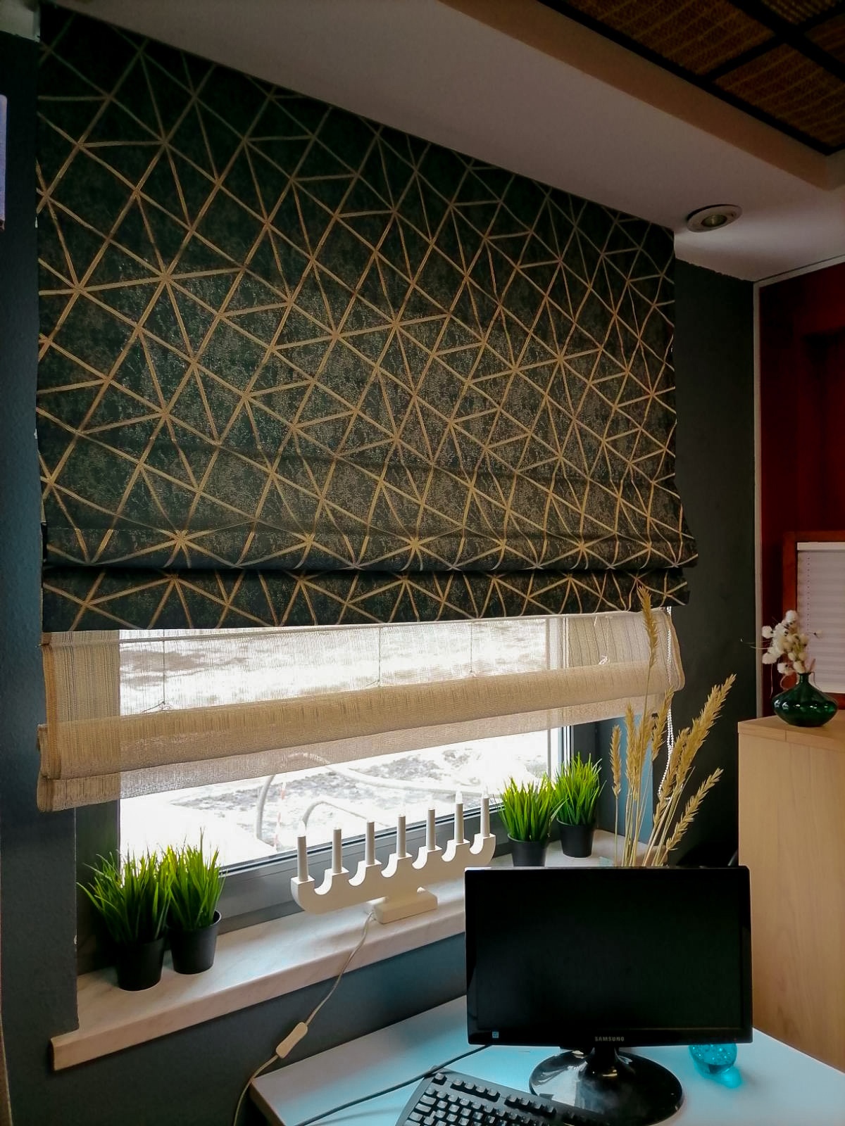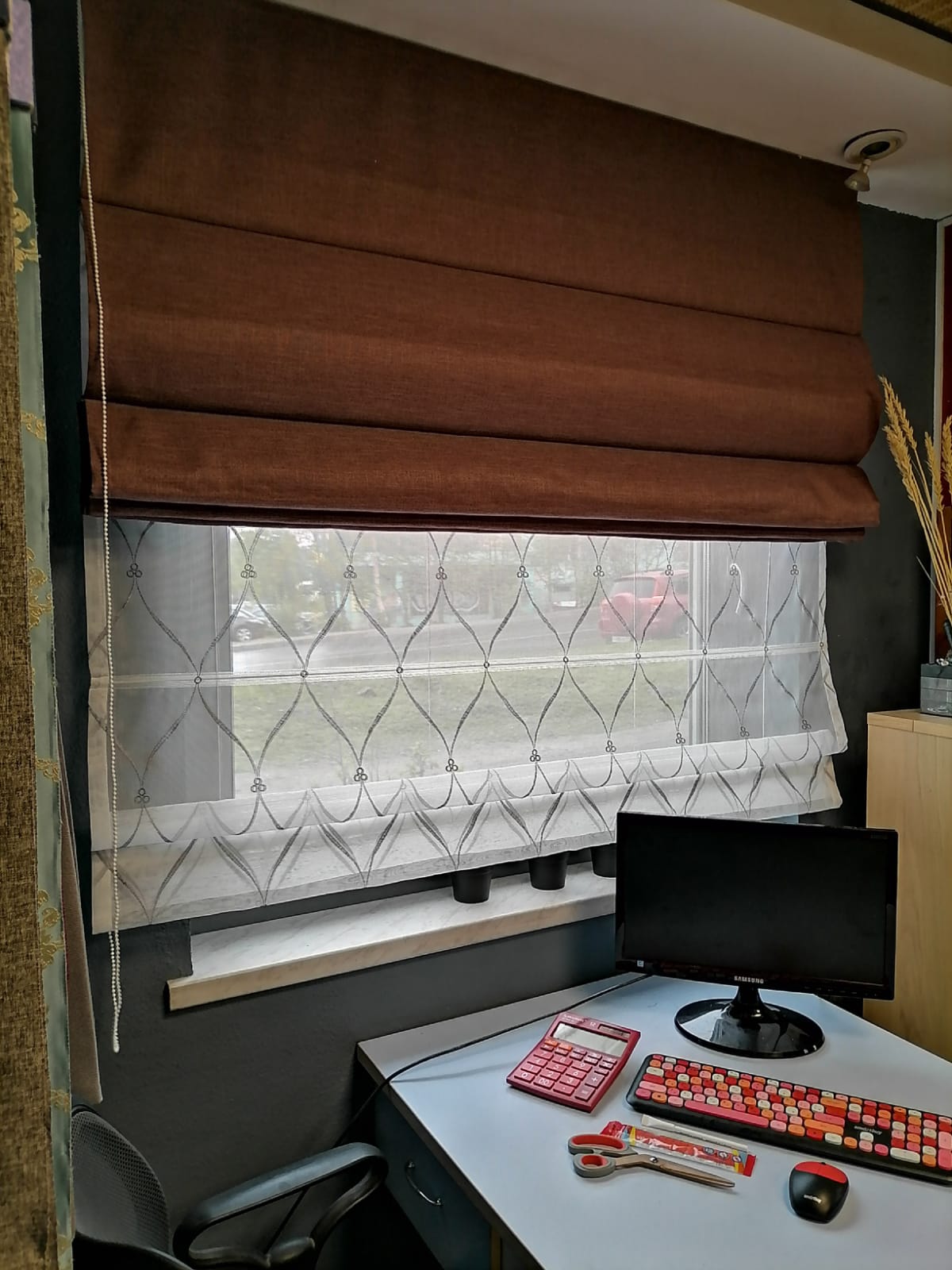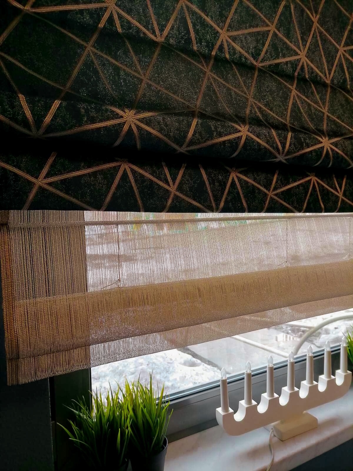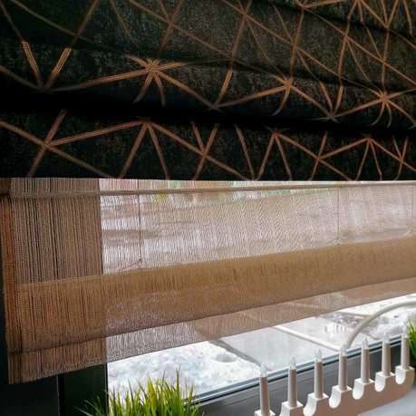 - Задний слой (День): Штора из прозрачной или полупрозрачной ткани (вуаль, сетка), которая рассеивает солнечный свет, защищая от любопытных взглядов, но сохраняя вид из окна.