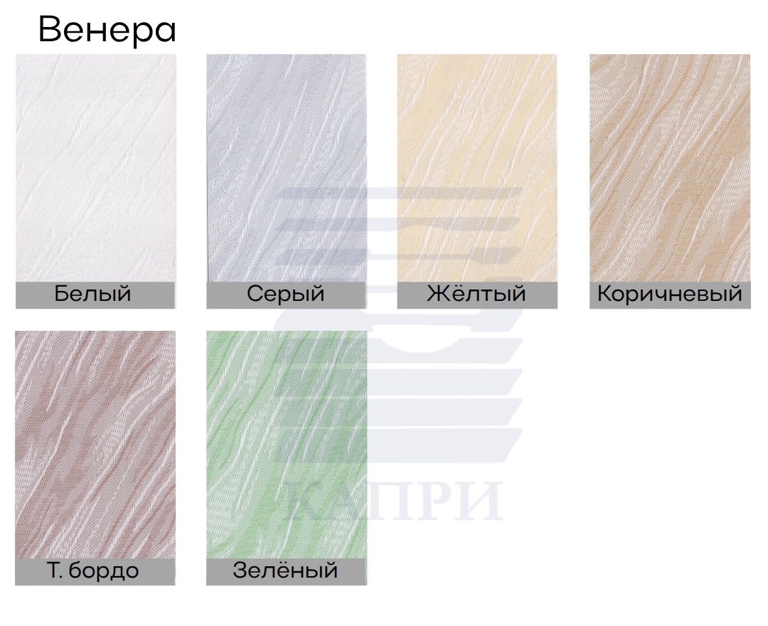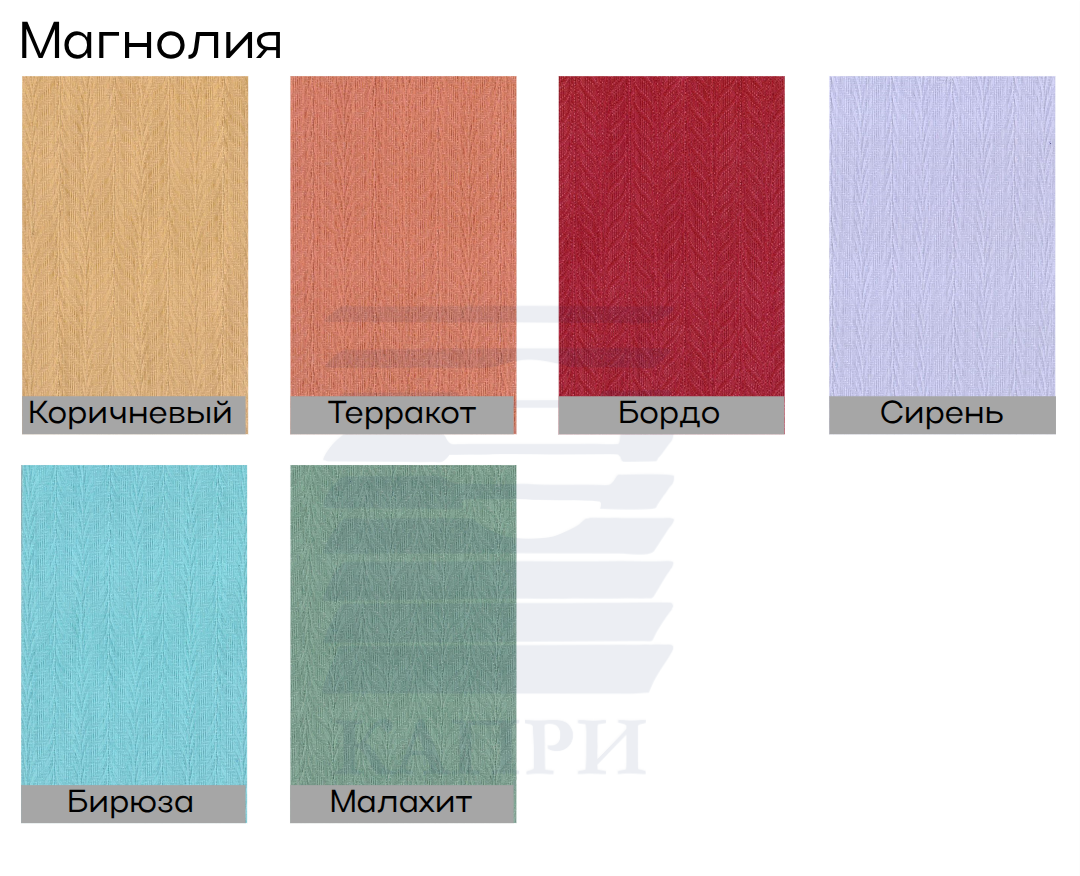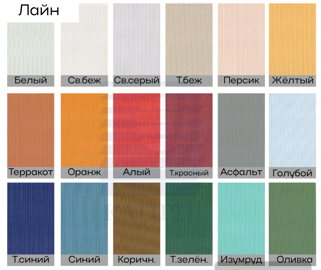 | Ламели (полотна) | Вертикальные полосы. Ширина 89 мм . Выполнены из ткани, пластика или алюминия. Ткань можно использовать полузатемняющую или BLACKOUT (с прорезиненным слоем с изнаночной стороны). |